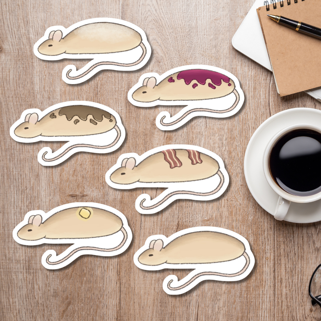I have these pancake ratties on the menu:PlainPowderdsugerButterBaconSyrupJamThey are 6x3,3 cm in size and made of premium vinyl.